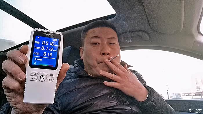 在车里点上一支烟,等这支烟吸完,车内已经烟雾缭绕,空气测试仪的数值也随着空气质量的下降而飙升,直到开始报警。