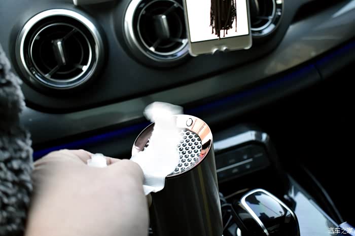 形似保温杯的空气净化器可以不占用特殊的车内置物空间,只要把它当做一个水杯找个杯架放着就好了。金属拉丝面板手感非常好,而且拿在手里不容易滑落。