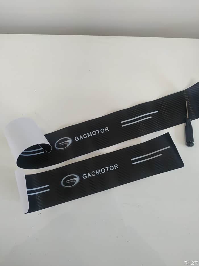 这套PVC门槛条一套十几块,便宜,收到后有些小失望,轻薄,传祺logo印刷的不清楚,暂且贴上用着吧,一套四张,前后长短不同,前长后短,前门长60厘米,后门长40厘米,宽7厘米,自带背胶,安装方便,揭掉后面的白纸粘到车门槛上就可以了。