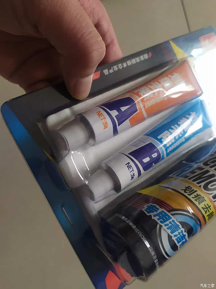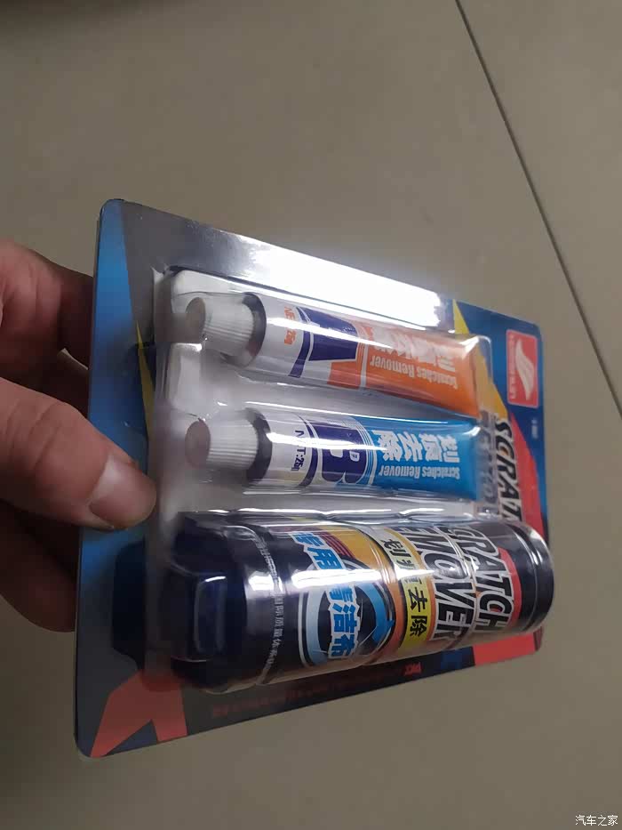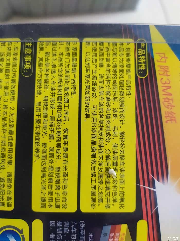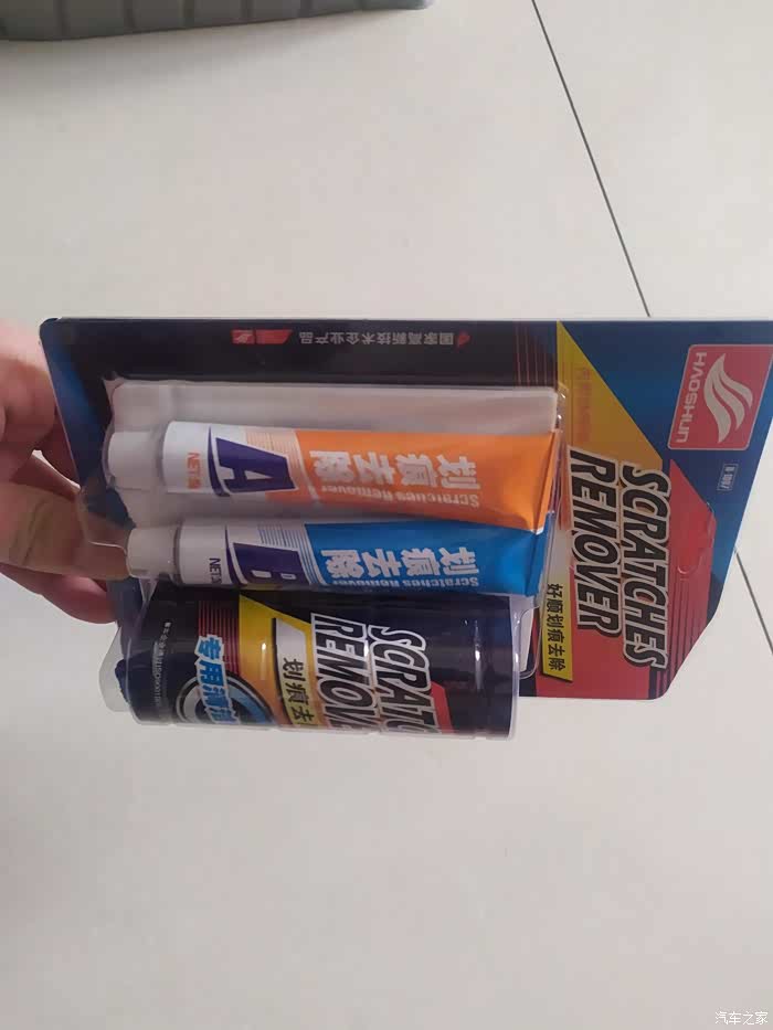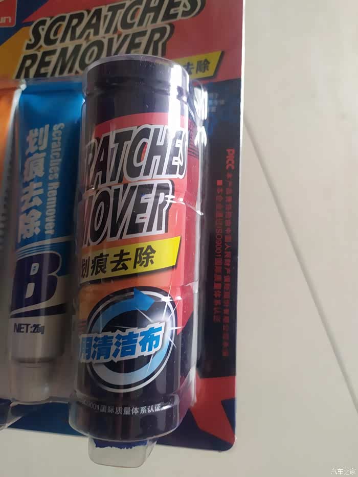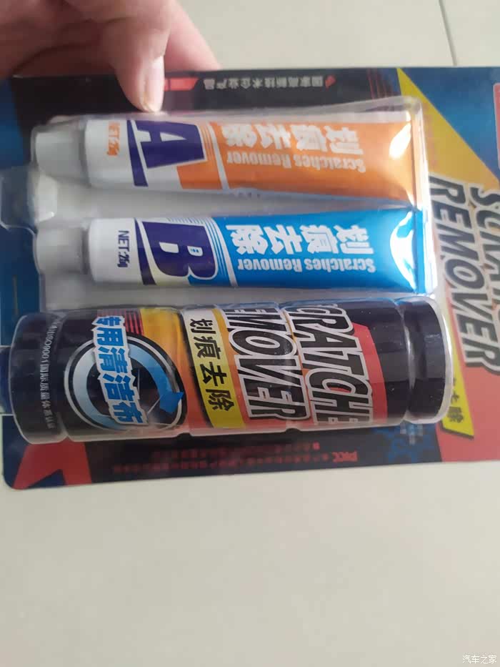 套装里的划痕修复蜡,是这件套装里包装最不同的一个了,它是使用了塑料盒纸盒双层包装,通过透明塑料纸盒,可以看到内部带有AD两部分划痕去除蜡,另外,右侧还带有专用的划痕去除蜡,使用时各种配件都已提供完整,操作起来省心省力。细看这两件瓶装,类似于牙膏一样的铝盒包装,分为了AB两部分,一款为橘黄色瓶身装,另一款使用蓝色瓶身装,而这两款划痕去除蜡作用和使用方法肯定也是不同的。A瓶则是用来修复漆面轻微划痕设计的专用产品,可以轻松的去除漆面的氧化膜和难以清除的顽固足够,花斑和毛刺等,从而使七层重新变得光滑有光泽。而B瓶则是用来配合A使用的,当A瓶蜡操作完成后,则是使用B瓶对车身进行进一步修复,用来恢复车身的光泽色彩,可以对车漆形成一层保护膜,从而对车漆进行进一步的维护保养,非常不错的产品。