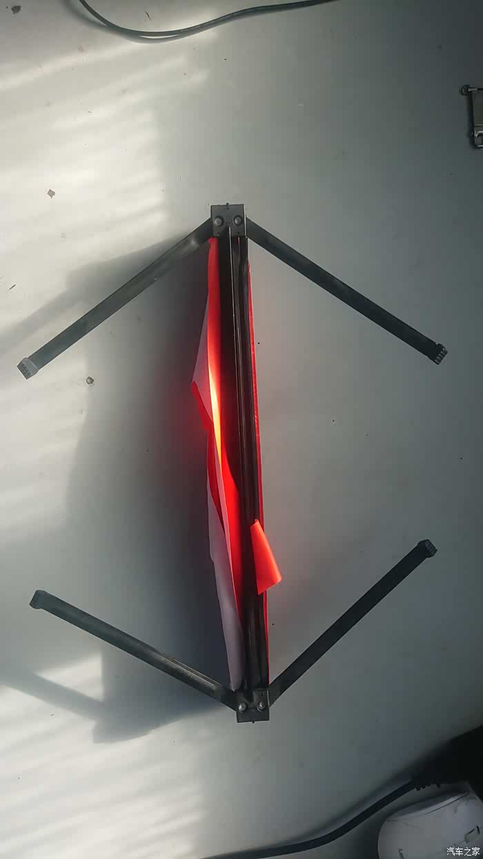 这个东西看上去很简单,只是三只反光塑料板组成的三脚架再加上四条腿就算完成了。平时放在后备箱中,在发生车辆故障或事故的时候,将他摆在车的后面,因为它具有反光功能,因此可以提醒后方的车辆注意到你,从而避免二次事故的发生。