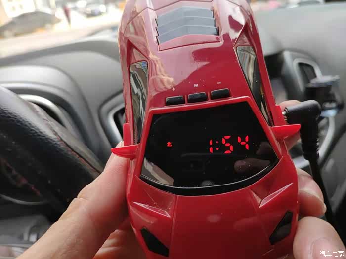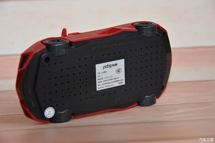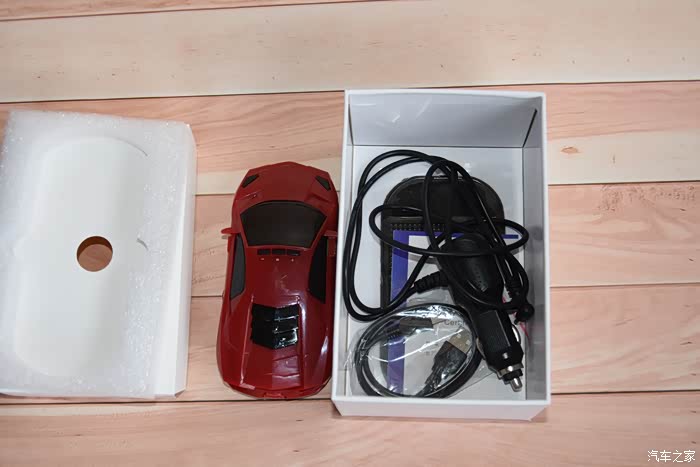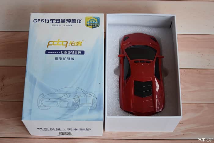 打开包装盒,里面是一款红色的,轿车造型的预警仪。