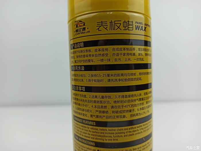 表板蜡正面,从上面的文字介绍就可以知道它用于仪表盘,皮革,还有上光的作用。