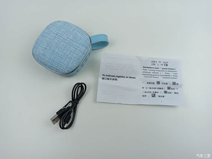 打开包装盒,里面是迷你音箱,USB充电线和一张说明书。