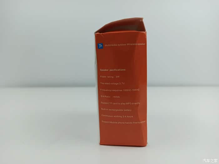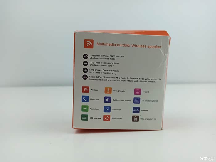 包装盒的背面可以明显看出这是款蓝牙音箱还可以免提接听电话。