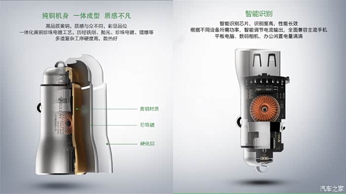打开包装盒,把这款车载充电器拿在手里,金属磨砂质感,手感非常好。在产品的一侧印有型号及输入输出功率。