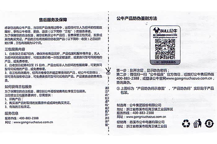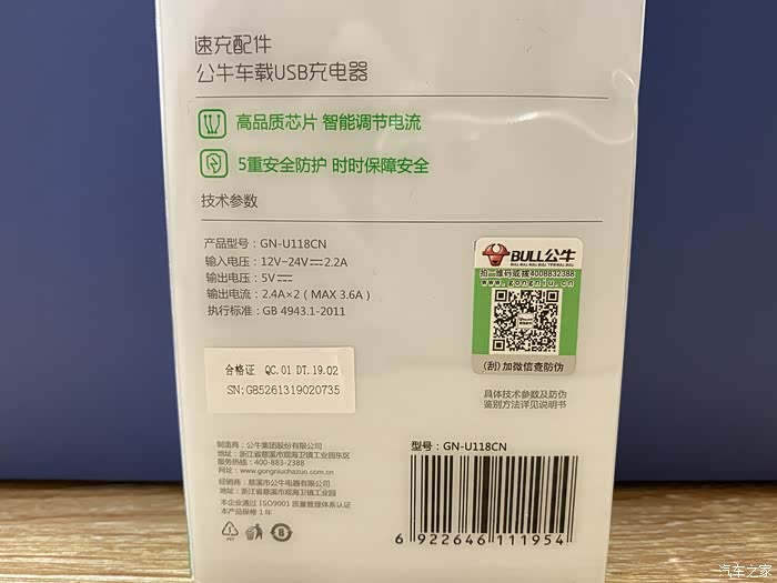 背面印有产品型号,输入输出电压及电流功率,与之不同的是,公牛系列产品都有自己的防伪标识,能够通过独有的序列号进行二维码查询真伪。