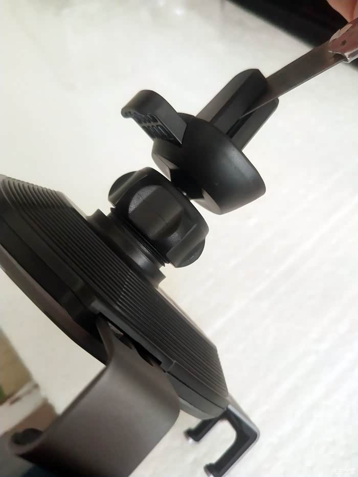 用的美工刀片做个试验,硅胶夹头很紧实,不松动。鉴于刀片和出风口的厚度有很大差异,夹上以后应该稳固。