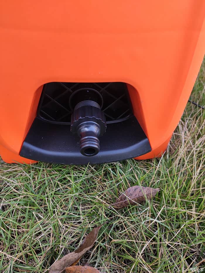 洗车机主体,黄黑配色,显得简洁大方。身材真的很小巧,高52CM,长32CM,宽为27.5CM。正面口子为进水口。