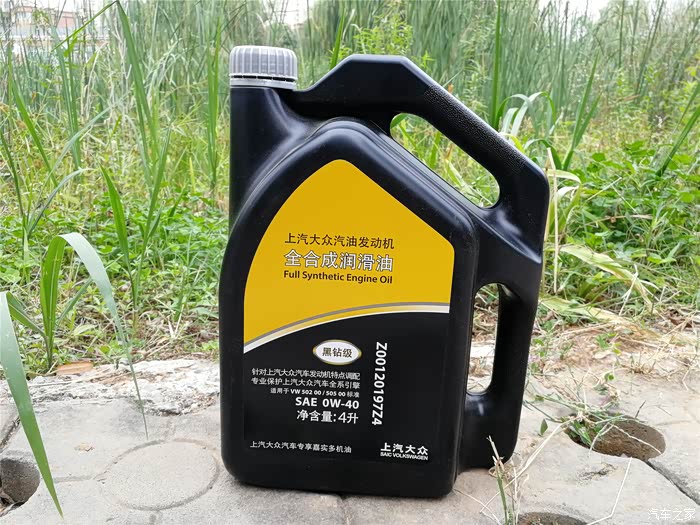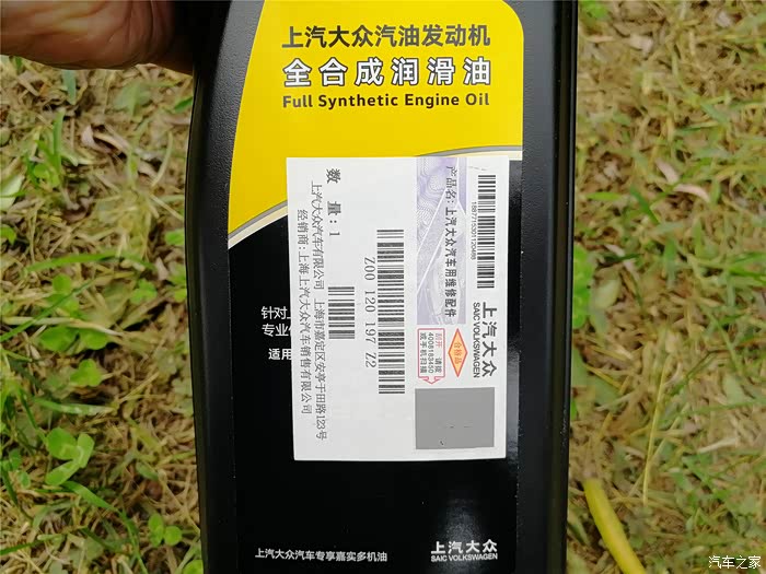 去掉保护露出真容,黑黄色的瓶身,很显眼。请君请看机油瓶的名字:上汽大众汽油发动机全合成润滑油。够长吧?真不是我要写那么长的。