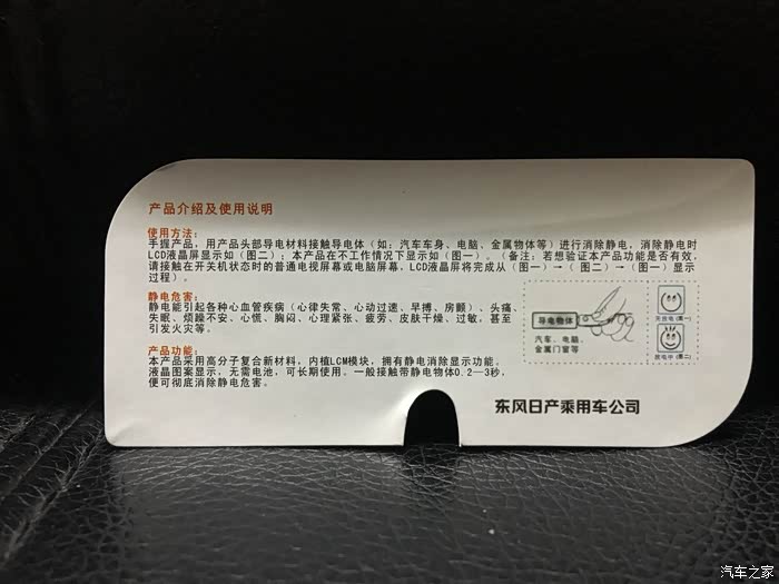 产品的功能还有注意事项。其实很简单。它的使用方法就是当上车的时候先用这个钥匙扣的橡胶头接触一下车门。当显示屏显示笑脸就是在饭店如果没有笑脸。证明这个门没有电。