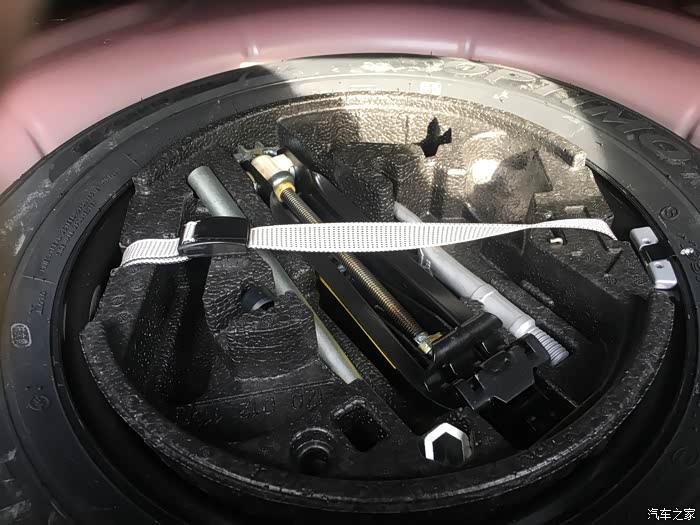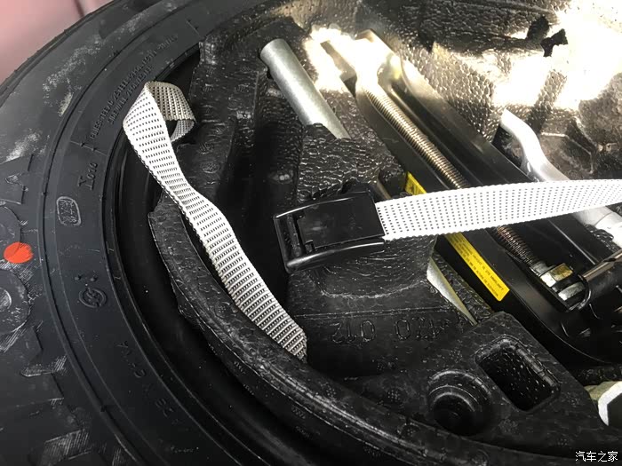 有些千斤顶是在轮胎里面的储物泡沫,有些是在后备箱其他的位置。我这个是大众集团的车子,统一都设置在备胎里面的储物泡沫盒里面。首先把固定解开才能放出来。