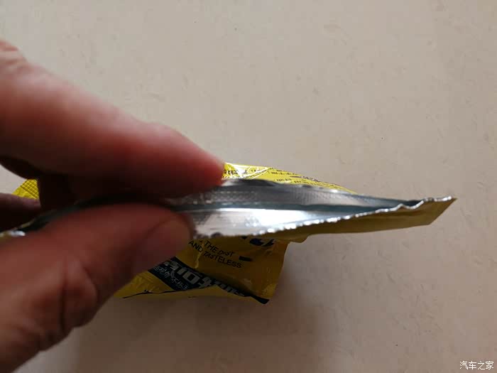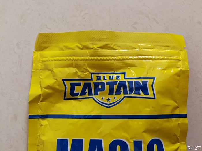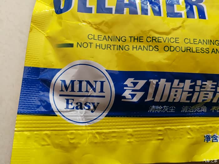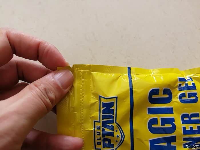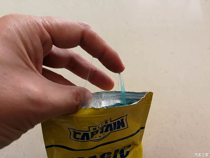 打开密封胶条,可以看到塑料袋内的蓝色多功能清洁软胶。