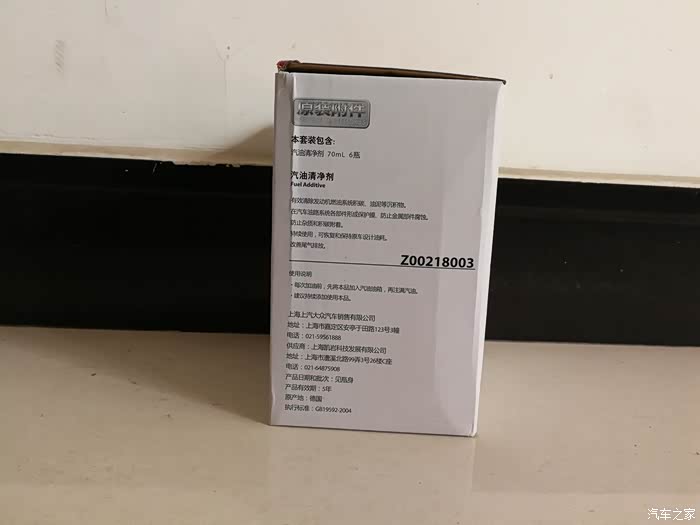 白色纸箱一侧的汽油清净剂介绍和出厂日期、零件号。