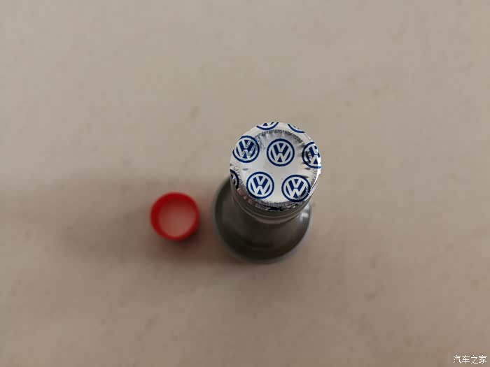 汽油清净剂打开瓶盖后,内部用锡纸密封着。银色锡纸上印有大众的图标。