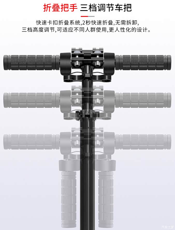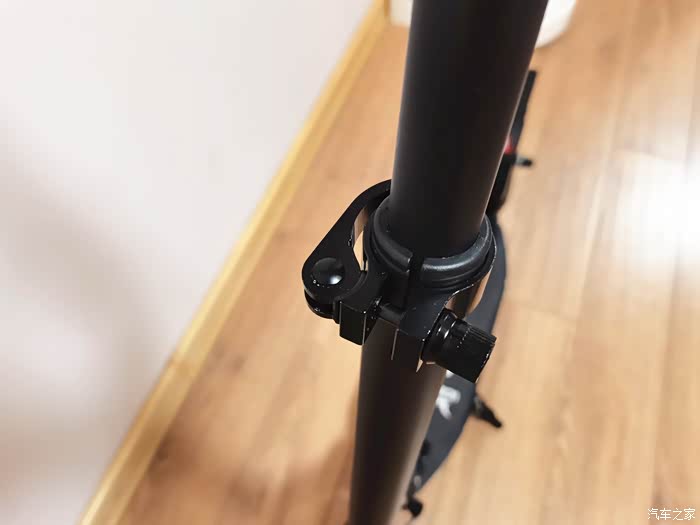 伸缩卡扣,通过这里可以实现手把高、中、低三档调节,满足不同身高人群的骑行要求,而且每一档除了卡扣,还有一个弹簧锁止,更增加了安全性...