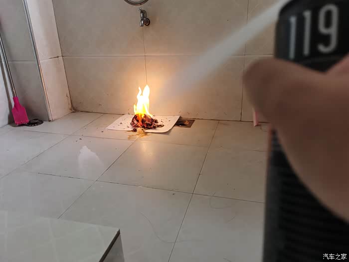 明火一下就熄灭了,水雾的冲击力度也比较大,把灰烬都冲开了。