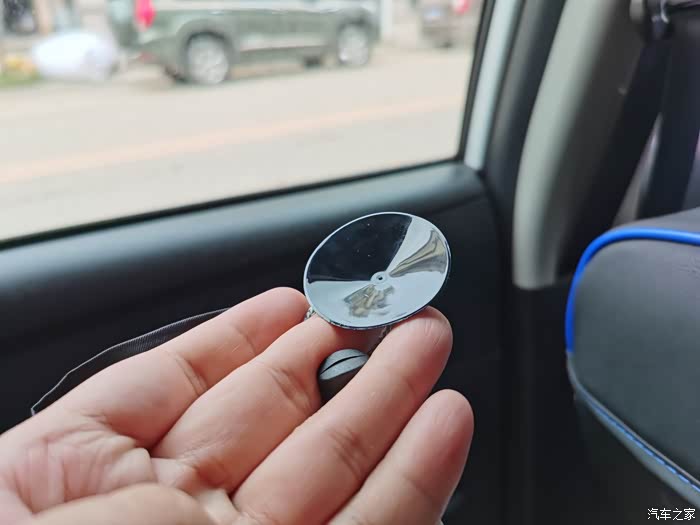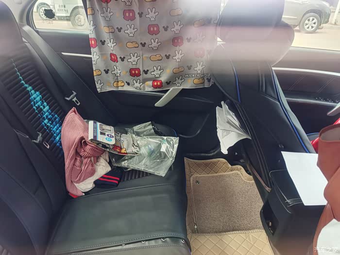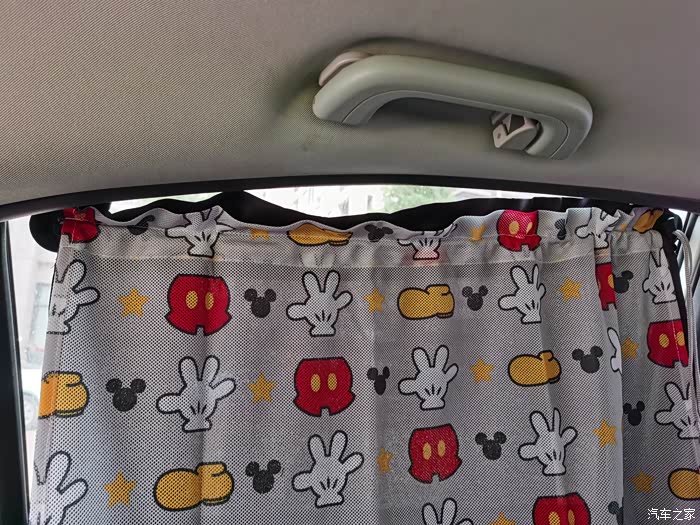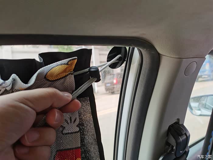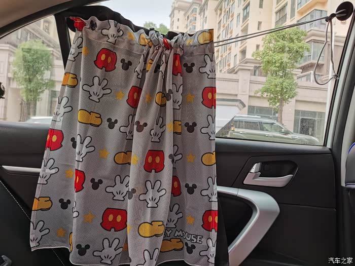 打开车门,窗帘悬挂在车窗上稍微有点突兀。