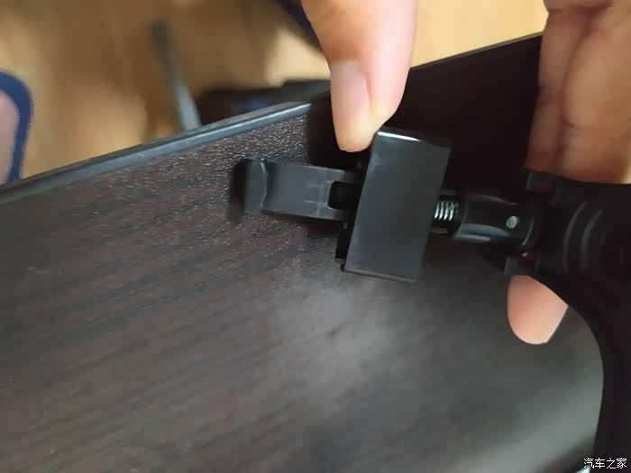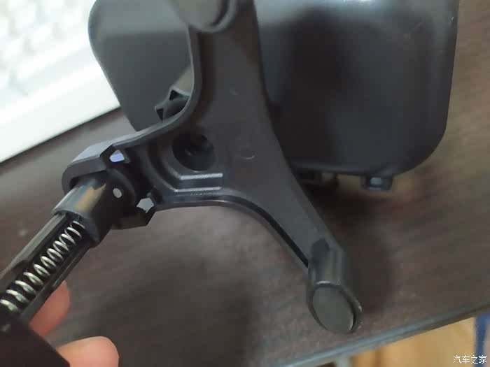 手机支架整体是使用的塑料材质,主要包括手机托盘,一个万向轴,还有固定底座组成。手机托盘与手机接触部分使用碳纤维材质,减轻中奖的同时,可以保护手机不被磨损,托盘左右是固定卡板,有弹性,可以卡紧手机两侧不会让手机脱落,托盘与底座中间连接部分,是一个万向节结构,球结构卡在槽内,松动螺母,既可以调节手机朝向,确定好位置后,拧紧螺母,手机托盘即可固定完毕。然后捏紧底座的卡板,对准空调出风口的扰流板,卡紧后松开卡板,即可完成整个手机支架的安装。