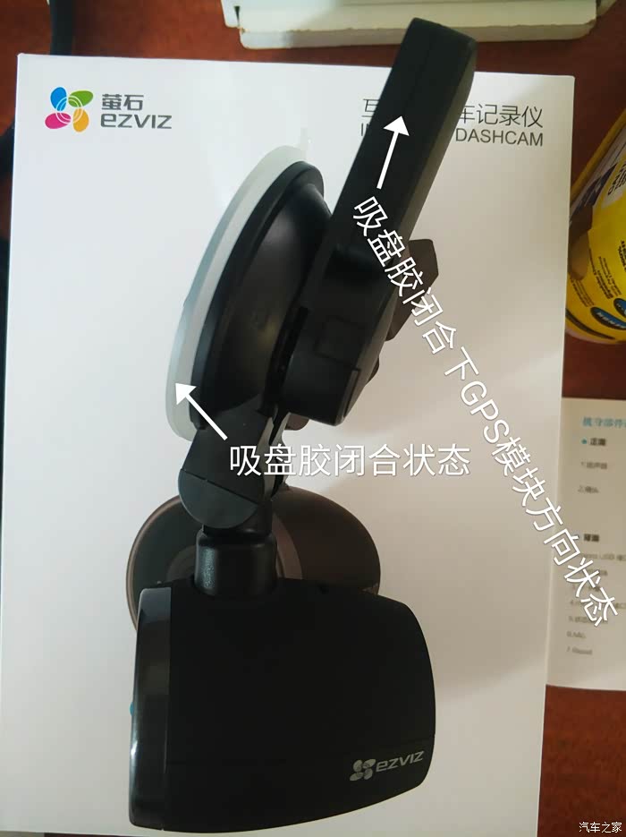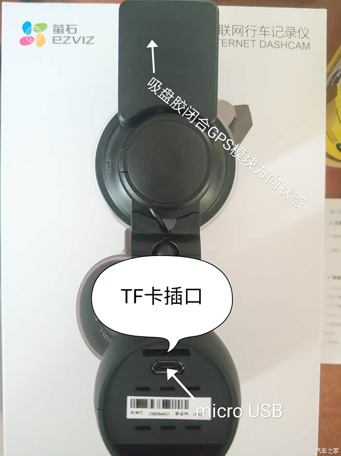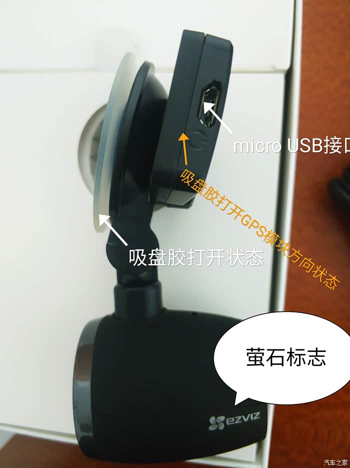 机身侧面,吸盘胶打开状态和GPS模块方向,模块上一个micro USB接口,机身萤石标志。