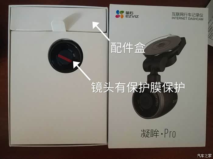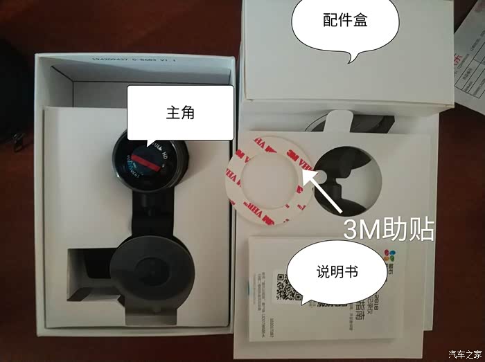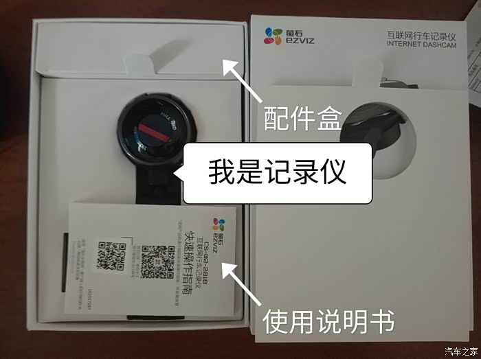 打开包装盒,里面单独区分产品,微露主机记录仪镜头,和配件盒。