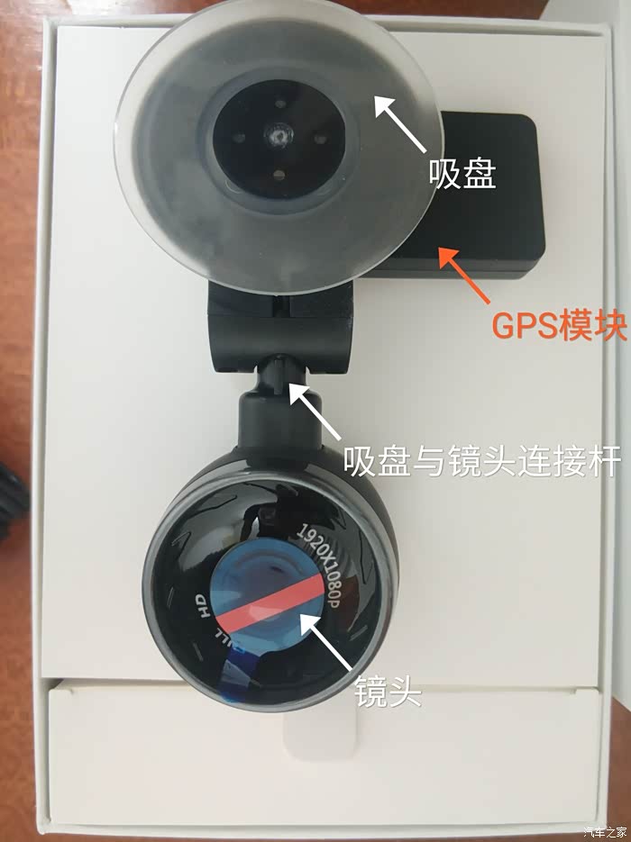 机身正面镜头膜正保护1920*1080P HD镜头,GPS模块操作吸盘开关,吸盘连接镜头杆角度调节,上下调节幅度较大,左右幅度微调。