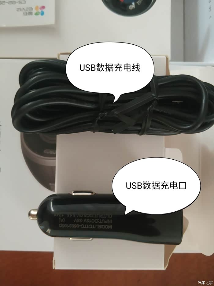 打开配件盒,有一捆USB数据充电线和USB数据充电口,目测数据线3米长以上,长线有利于方便走线。