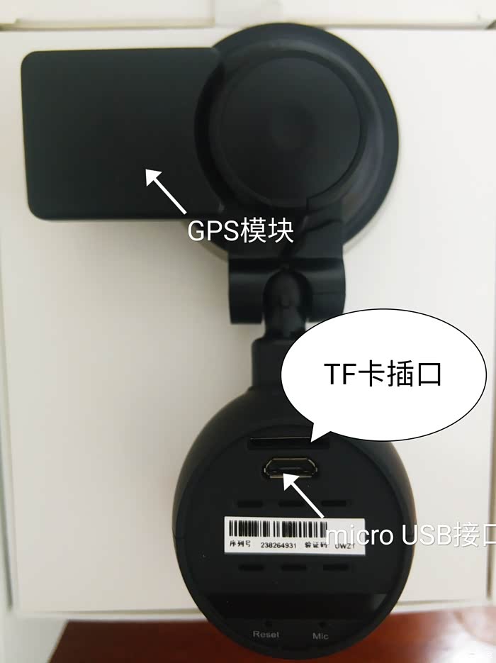 机身背面看,当吸盘打开状态下GPS模块方向是向左边。背面有一个TF卡插口(建议使用A2级以上内存卡),一个micro USB接口。
