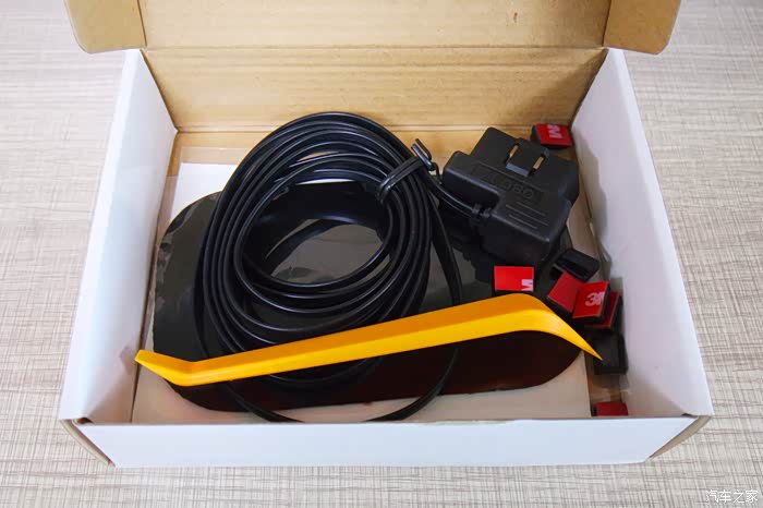 在打开里面,有电源线,撬棒,布线扣和HUD防滑垫,高清投影膜等工具。
