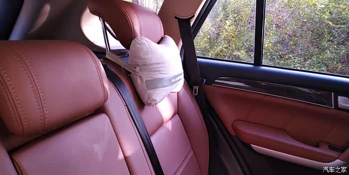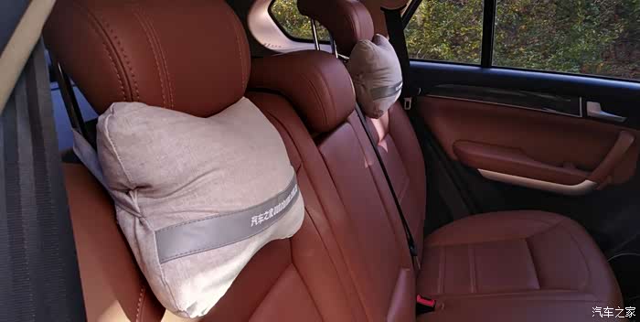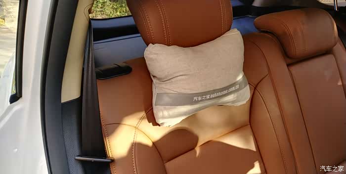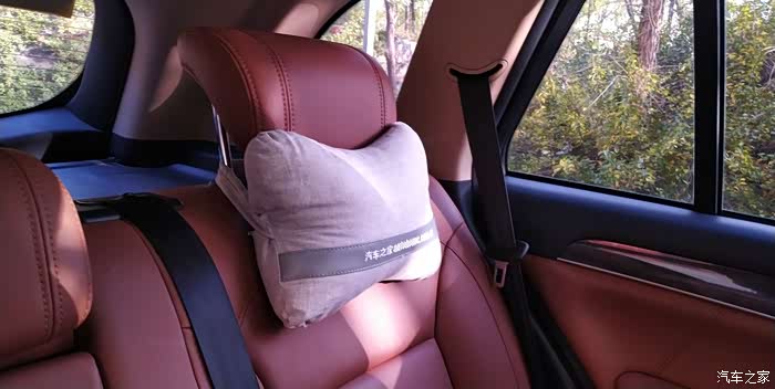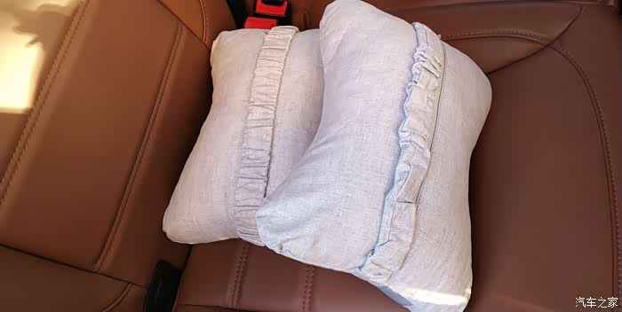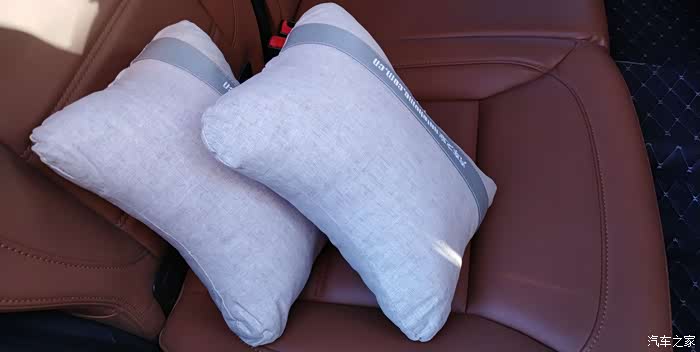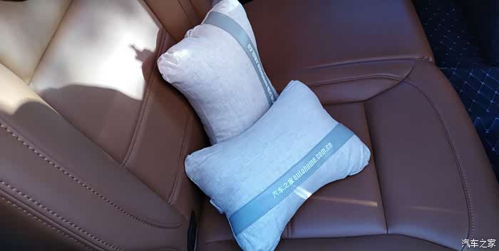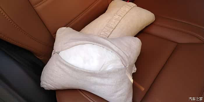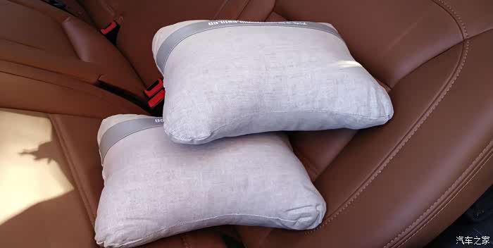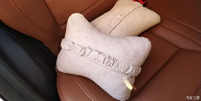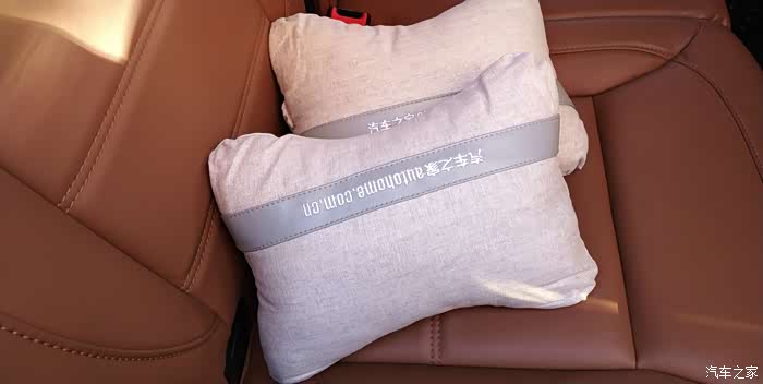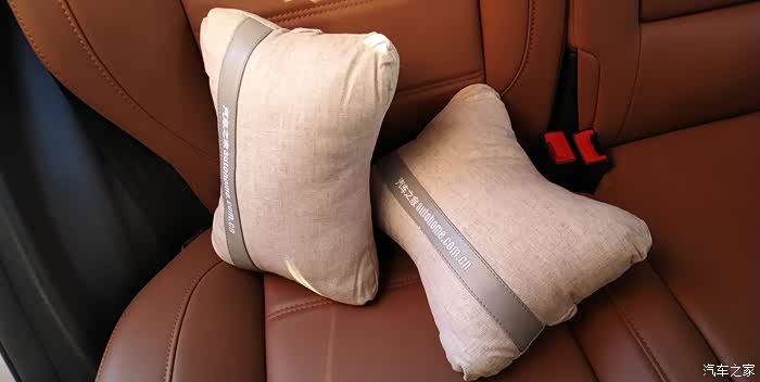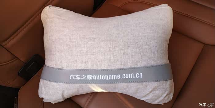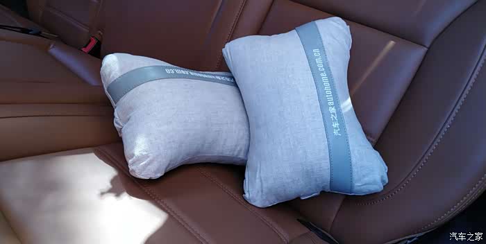 这款颈枕为汽车之家出品的,灰色仿亚麻材料外皮,材料环保耐用,上面带有仿皮的横条装饰条,装饰条刺绣白色汽车之家标识,颈枕内部填充物为白色丝绵,并且是个独立整体的,可以单独拆卸出来,方便颈枕外皮的清洗。
