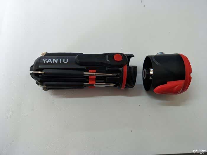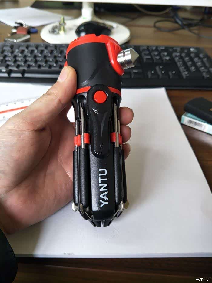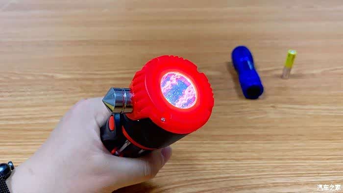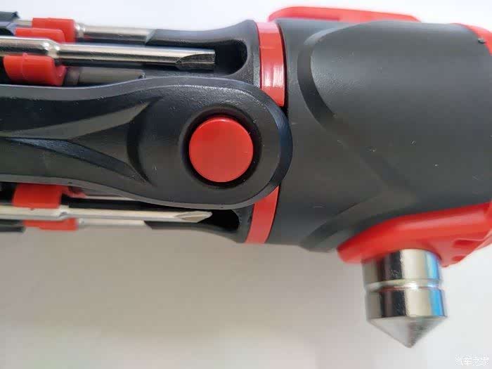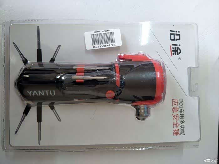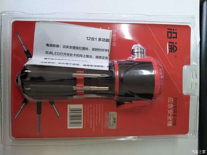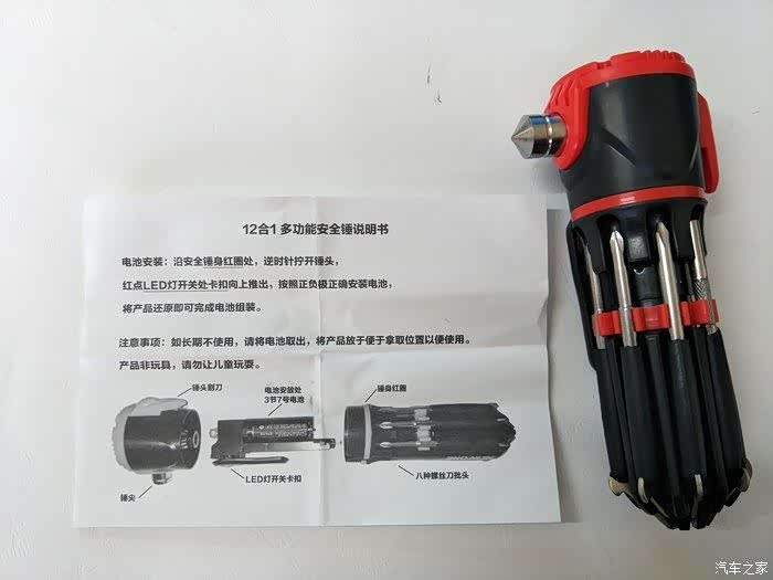 名称:车用多功能应急安全锤;功能:1、破窗锤 2、切割器(用于割断安全带)3、电筒(需自备7#电池3节)4、8种螺丝刀头(十字四种、一字四种)5、作业照明灯(位于产品尾部,下面有演示图片);生产厂家:南京沿途汽车用品有限公司