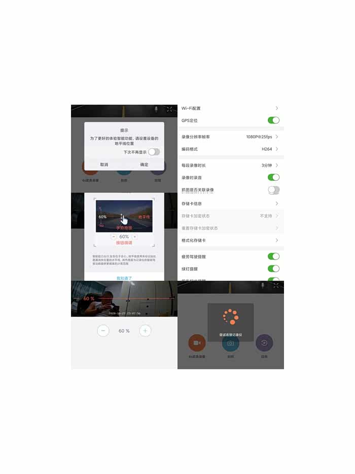 这新设备需要用wifi与手机相连才能看到图像,还好我能弄懂,把页面上那些截图组合到一起,让大家了解一下,什么WiFi配对,下载app,寻找设备,调整地平线设置,等等,要是对手机安装调试不懂的,要耐心点!弄一次,基本完成。出去实车测试。