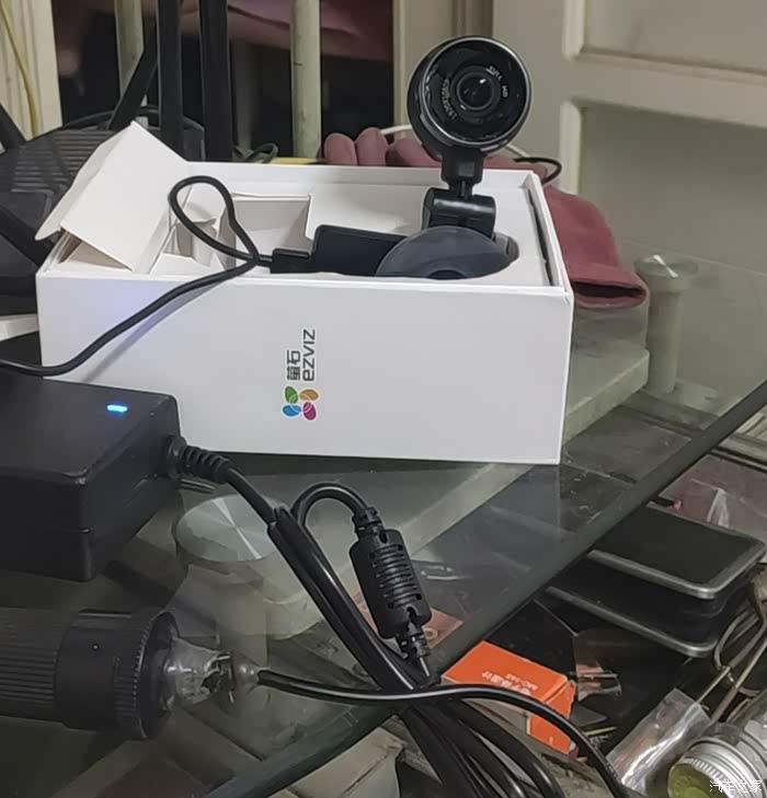 展示一下萤石互联网行车记录仪的组成,本体主机摄像头,电源线以及12v电源适配器,看着很简洁,连接很方便,小巧玲珑的!由于手里没有内存卡,所以赶紧去买了。室内直流电源接线测试。