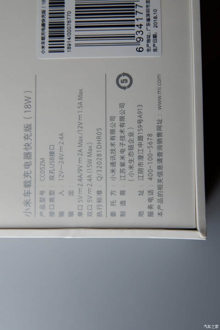 这款车充的型号为CZCDQ01ZM,输入电压为12-24V,支持主流的各式汽油、柴油和新能源车型;输出电压为5V,具有两个USB输出接口,可同时为两台设备充电,并可智能识别苹果和安卓不同设备,自动调整输出电量;单口额定电流2.4A,双口最大输出电流为3.6A,合计18W。