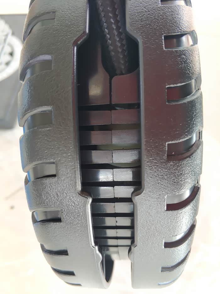 外观采用经典的轮胎造型设计,充气管环绕主机收纳,比较方便。