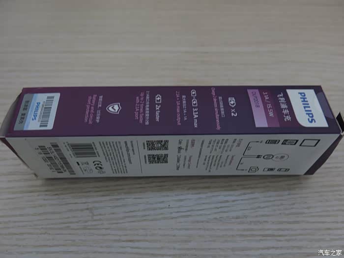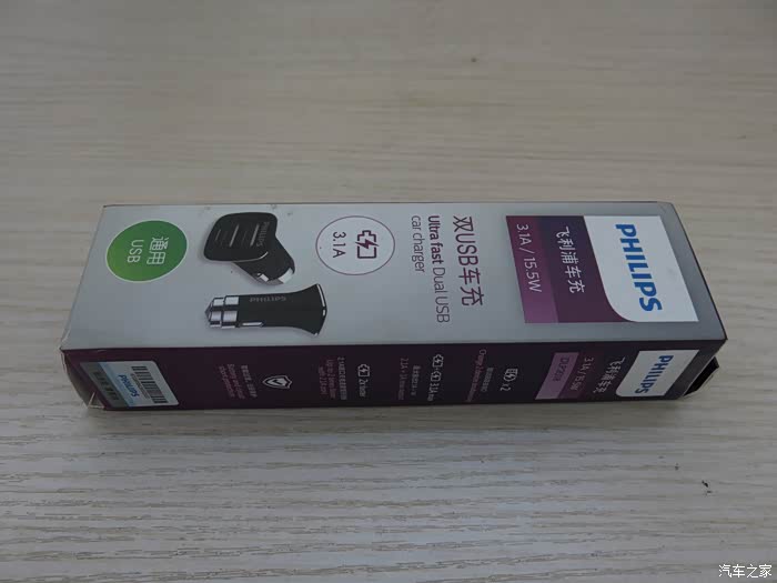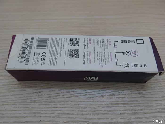 包装盒正面印有PHILIPS品牌、型号、车充名称、以及外观图等信息。