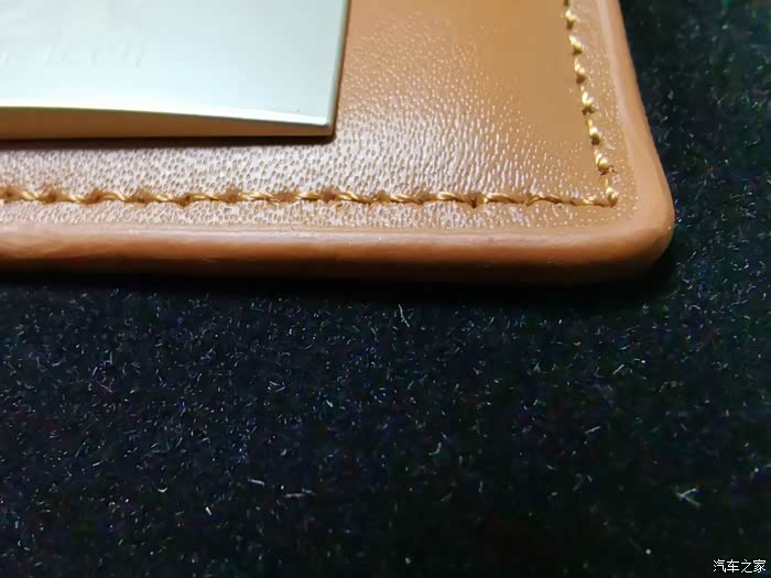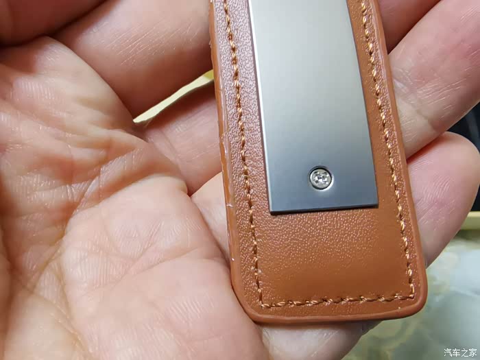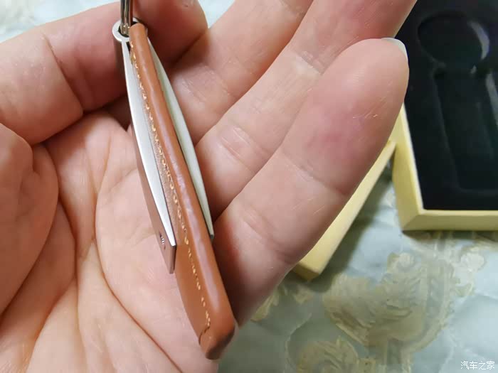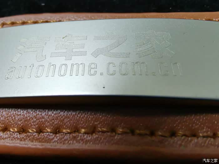 这款汽车之家钥匙扣,中间是皮质的,质感很不错,两边使用不锈钢进行了固定定,并且镀刻汽车之家的LOGO。