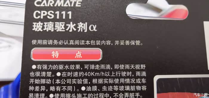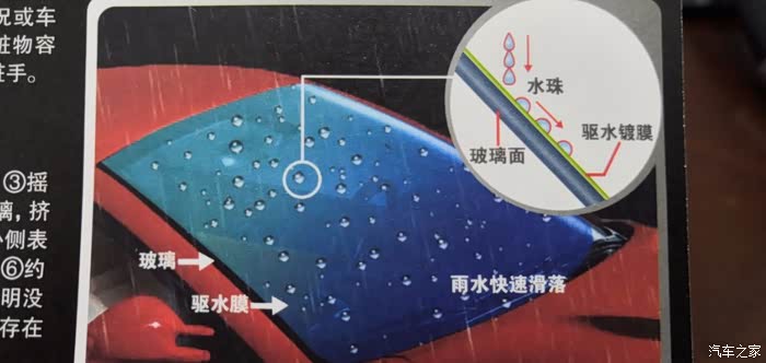 玻璃驱水剂是利用纳米材料的化学疏水原理,在汽车玻璃表面镀上一层极薄纳米膜,防止雨水沾附在玻璃上形成不规则的水膜导致视线模糊,同时不伤雨刮及玻璃。一般当车速达到45km/h以上的时候,基本可以不使用雨刮,凝聚的水珠便会在玻璃表面自动弹走。不过出于安全方面的考虑,在下雨时,逆光或在隧道出口从暗处到明处时会晃眼,此时需要开启雨刮,视野便可恢复清晰。其效果可以维持大概3个月。