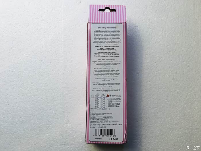 大家好,今天为大家带来一款魔法车用家用热风枪点评贴,热风枪主要是利用发热电阻丝的枪芯吹出的热风,我们可以用它做手工diy软陶,也可以用来加热热缩管,或给爱车贴灯膜。用途非常广东。这款热风枪为300W功率,5秒速热,小巧便携 手持不发烫,散热快,机身长225MM,宽47MM出风口12MM,温度范围200度,带有折叠支架,在使用后防止枪嘴高温把桌面烫坏。颜色有黑色和白色,我拿到的这款是白色。下面我们一起来看看这款产品的细节做的如何。