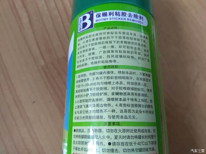 粘胶去除剂可瞬间将贴在车窗或车身、挡风玻璃上的不干胶等粘贴物撕下来,还可将不干胶撕掉后残留下的浆糊物质轻易去除,具有清新香味,一喷一擦,即可轻松去胶。粘胶去除剂适用于汽车玻璃、广告牌等有粘贴物的表面,如汽车车身不干胶标签、挡风玻璃粘贴物等。很多车友喜欢给新车各种装饰,原车以外的这些装饰品要想固定在车上,基本上都要用双面胶粘住,像车窗亮条、车门拉手装饰盖等等,审美就不说了,有人觉得好看,有人觉得土,但是关键的问题上,如果哪天对这些装饰审美疲劳了,你想把残余的胶去除就是个头痛的问题。很多车友就各种论坛搜索去除残胶的方法,像风油精涂抹、柏油清洗剂喷一喷,有的还用砂纸打磨,真是无所不用其极,到最后真是惨不忍睹,推荐大家使用粘胶去除剂好用不贵。