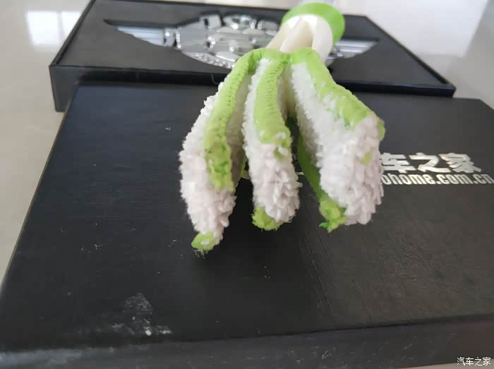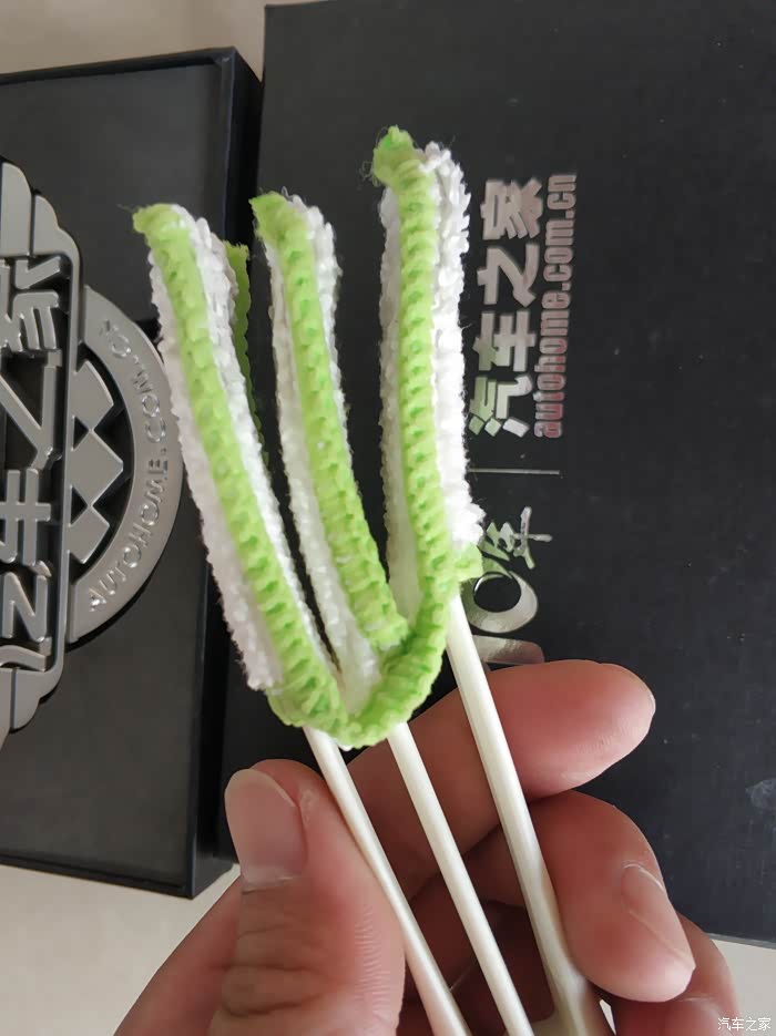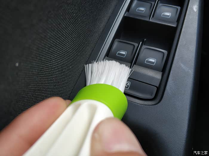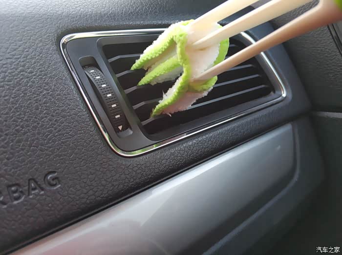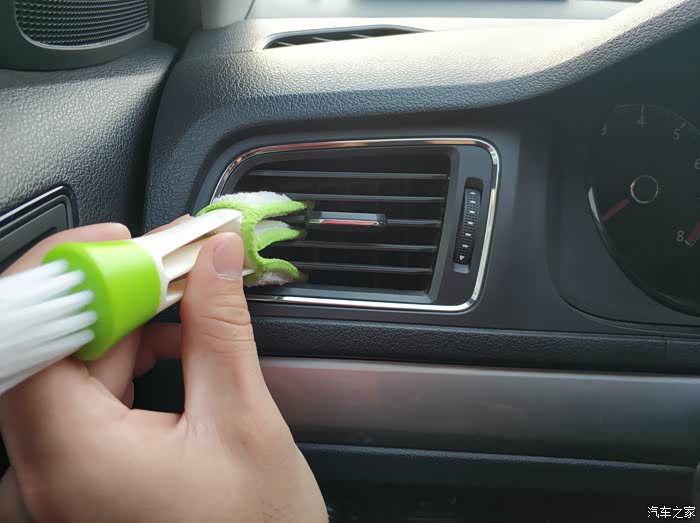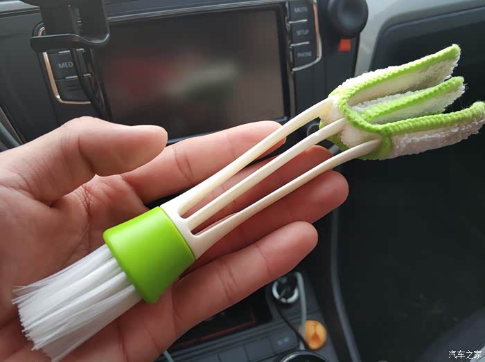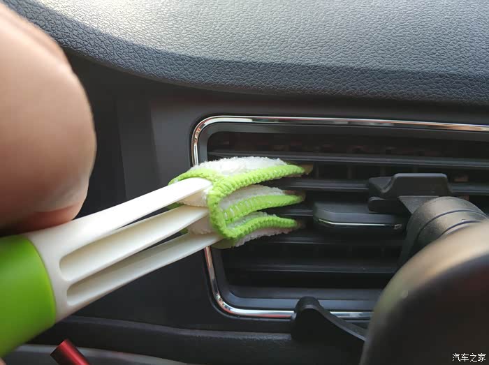 这个小工具设计最巧妙的地方就是这三片小爪子的弧度了,这种设计使它能够非常容易的深进空调出风口的到叶片里,并且轻易的在里面游走,通过用手控制三个叶片的夹合力度来擦掉出风口导风叶上面的灰尘。实际实用下来清理的效果也是非常的不错的,清理的非常干净。除了下面可以活动的出风口到叶片,中控台上面两侧用来吹玻璃的固定导叶片也是可以用它来清理的,大体上清理的还是比较干净的,只不过由于角度关系,边角的地方可能会有非常少的污渍残留。