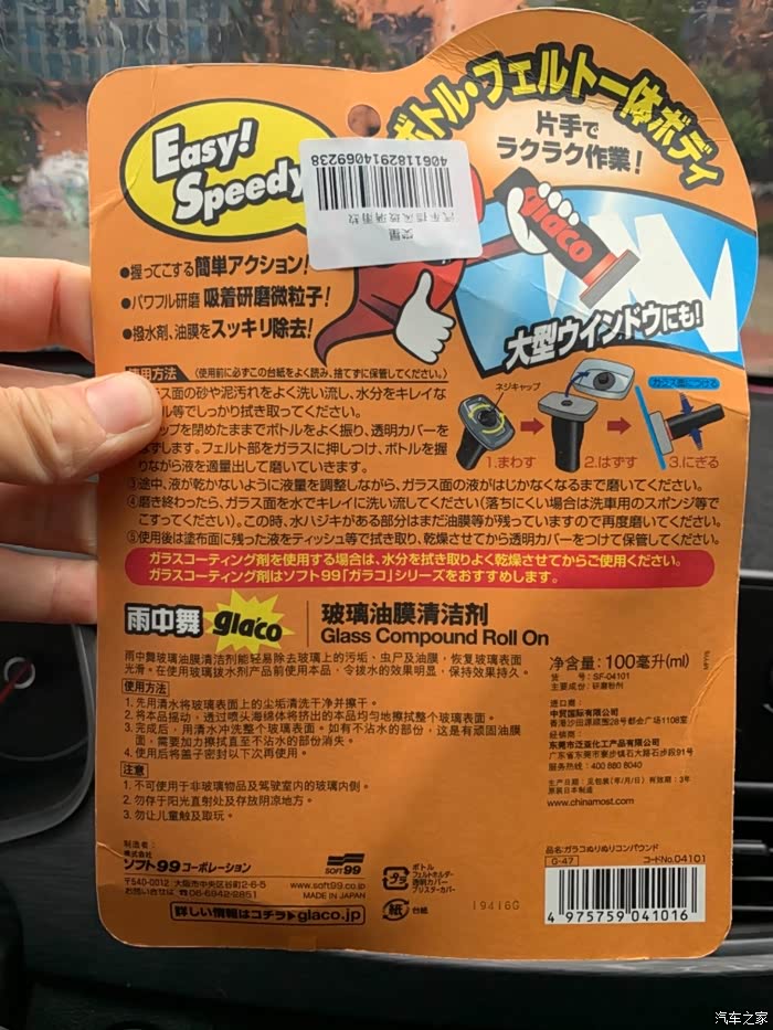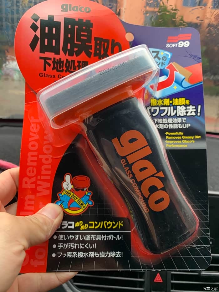 很高兴今天收到了 sotf99玻璃油膜清洁剂,对我来说并不陌生,因为车辆在使用过程中,挡风玻璃经过长时间的暴晒、大雨淋刷、风蚀等的原因,使得挡风玻璃的表面微观上出现很多洞孔或者坑洼的粗糙表面,在经过时间的积累,一些油类物质、车蜡类物质以及平时在行走时漫天的灰尘都会轻易的粘附在挡风玻璃变粗糙了的表面上,时间长了有一小部分物质还会与玻璃形成化学反应,这样就更加不好清洁干净了,因此就会出现了这样的油膜层。洗车只能表面的清洁,最内层的物质始终附着在玻璃上面,一到雨季雨刮不干净,玻璃雾茫茫的一片,不仅遮挡视线,给行车造成的危险,平时我都是用洗洁清洗玻璃这款产品可以说是我的救星,到底试用效果怎么样,接下来就请各位和我一起拭目以待把。