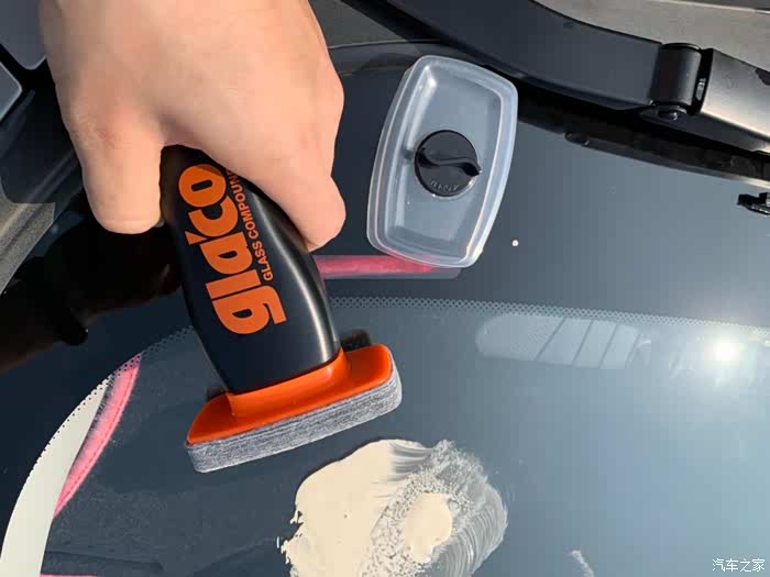 车玻璃从中间一分为二,这样的对比较明显,以打圈圈的方式均匀的把去除油膜液打在车玻璃上。静待几分钟之后用水冲干净。