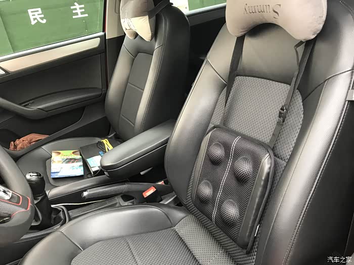 黑色与目前大部分车型比较和谐,刚好媳妇的爱车座椅也是黑色织布+真皮,靠枕很随意的融入到了座椅当中丝毫感觉不到它的违纪感。