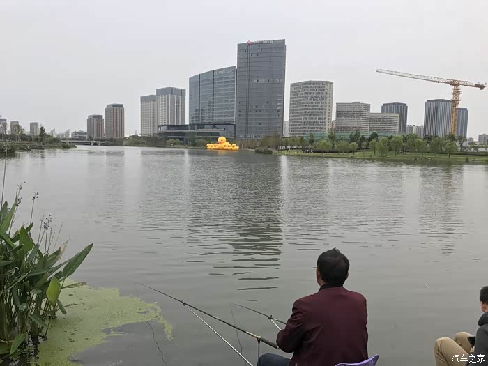 悠闲地在湖边上钓着鱼遥望对岸一群大黄鸭与身后的五星级酒店