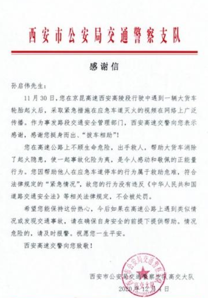 之后,西安交警高速大队也为孙师傅送了一封感谢信。感谢信中写道:您在高速公路上不顾生命危险,出手救人,帮助大货车消除了起火隐患,使一起事故化险为夷,是令人感动和敬佩的正能量行为。