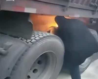11月30日,在陕西京昆高速西安高陵段,一辆行驶的大货车突然轮胎起火。而就在这时,一辆还没挂牌的新车冒险将大货车截停。