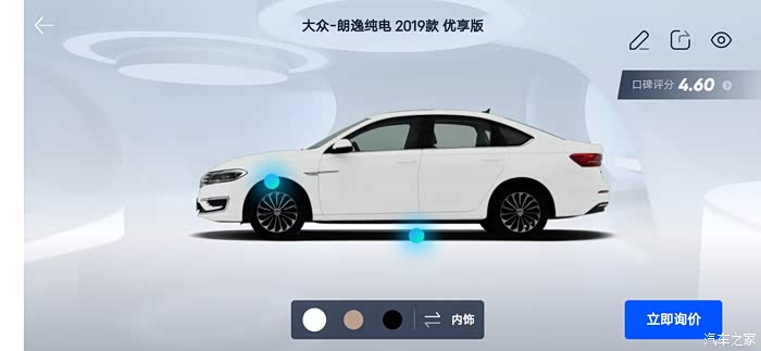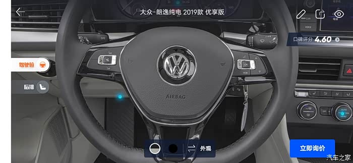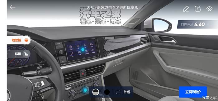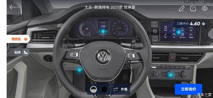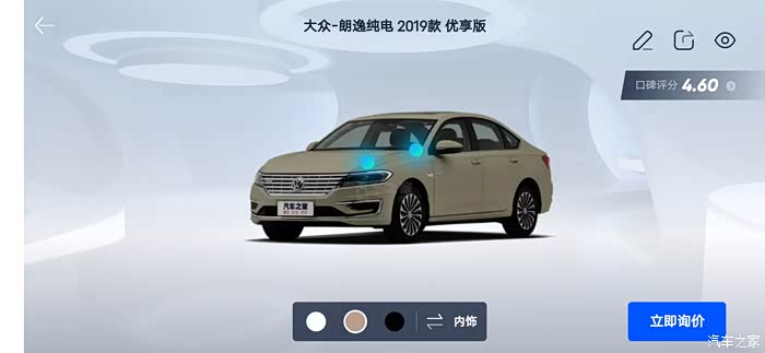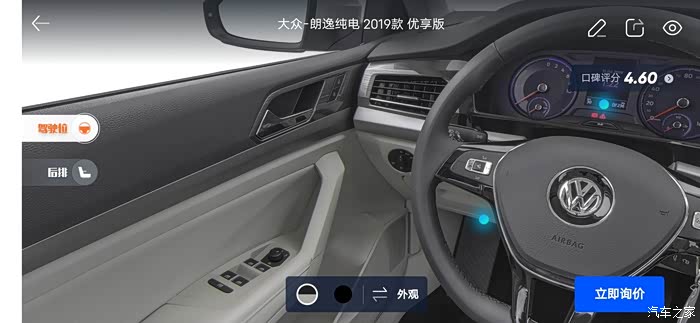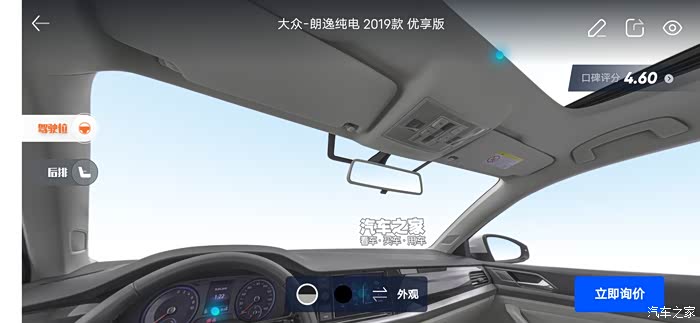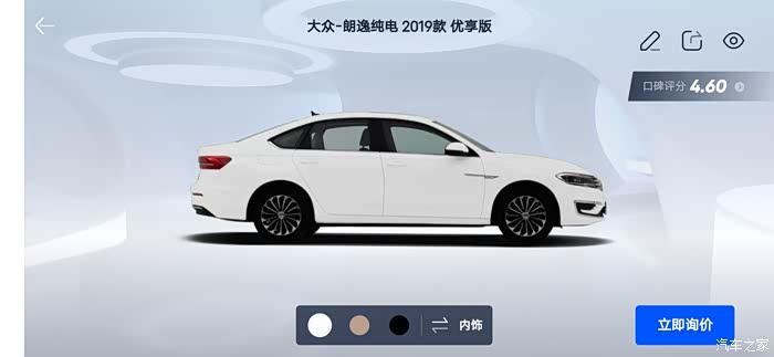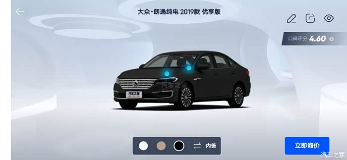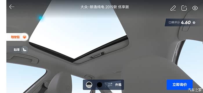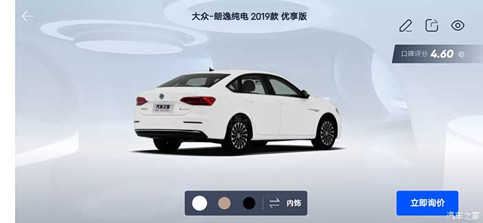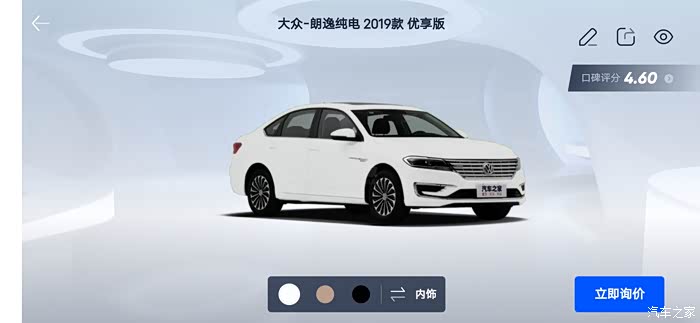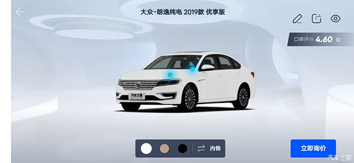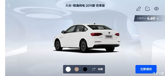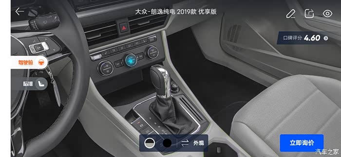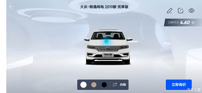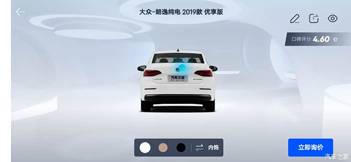 汽车之家AR看车可以任意切换角度,外观还是内饰都可以收放细致观赏,下面一起来看看今天的主角朗逸纯电,首先一起来看下朗逸纯电的参数配置:长宽高分别是 4670/1806/1474mm,轴距:2680mm,但是作为家庭使用尺寸完全足够,这台纯电搭在的是一台电动机完成动力输出,最大马力136匹马力,最大峰值扭矩高达290牛米,这套动力总成对于家庭代步是完全足够了,动力输出平顺强劲,颜色也是非常全面。