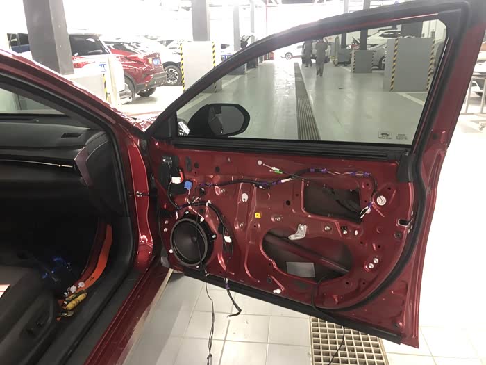回丰田店让工人更换,原以为很简单,其实换起来也很麻烦,需要拆门板,穿孔走线连接到中控台下方插口对接,按着安装视频一顿操作,花了将近两个小时才完工,大家可以借此看到亚洲龙门板内的防撞梁,在它上方还有一道加强筋,照片角度问题没有拍到