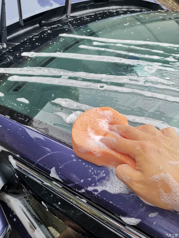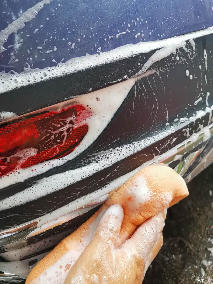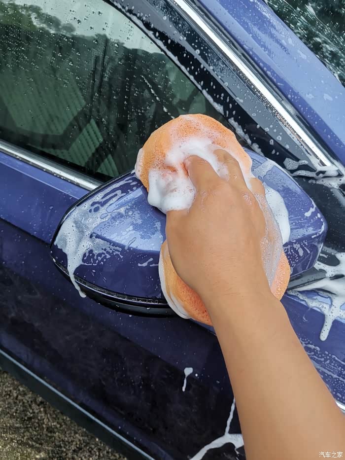 第三步,将洗车液与水搅拌均匀,用泡沫块涂抹在车身上进行清洗,在清洗过程中,确保车漆每处都能有泡沫水擦试过。